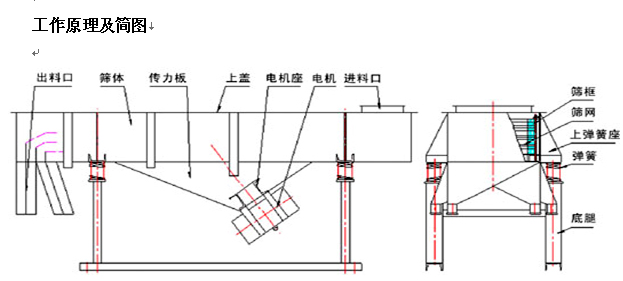 當(dāng)縱向安裝在篩體上的兩臺(tái)振動(dòng)電機(jī)相對轉(zhuǎn)動(dòng)時(shí),兩臺(tái)振動(dòng)電機(jī)兩端的偏心塊便產(chǎn)生額定激振力,其產(chǎn)生在橫向的激振力相互抵消,其縱向的激振力通過傳振體傳遞到整個(gè)篩面上,從而使篩面上的物料受其激振力而在篩網(wǎng)面上向出料口方向跳躍運(yùn)動(dòng),小于篩孔的物料通過篩孔落到下層,經(jīng)連續(xù)跳躍后經(jīng)出料口流出,由于篩分過程合理,便可將物料經(jīng)振動(dòng)篩分級后,取得幾種不同規(guī)格的物料,完成物料的分級作業(yè)。